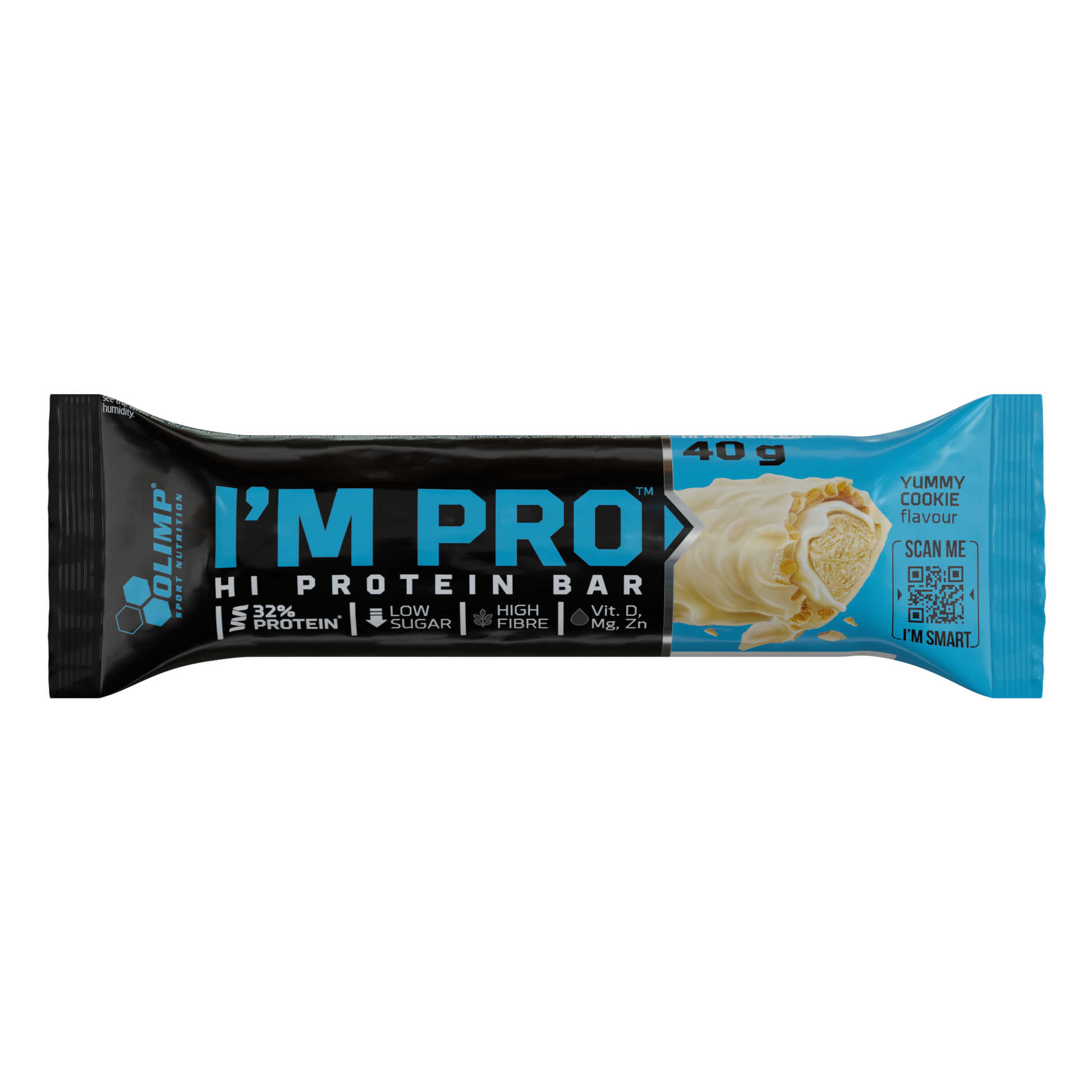 Olimp I’M PRO PROTEIN BAR *High-protein bar (32% protein) with sweetener, with a coffee flavour, with a coffee flavour layer (18%) and crispies (9%), covered with white chocolate (31%). With the addition of vitamin D, magnesium and zinc. Low sugar. High in fibre. Coffee flavour.