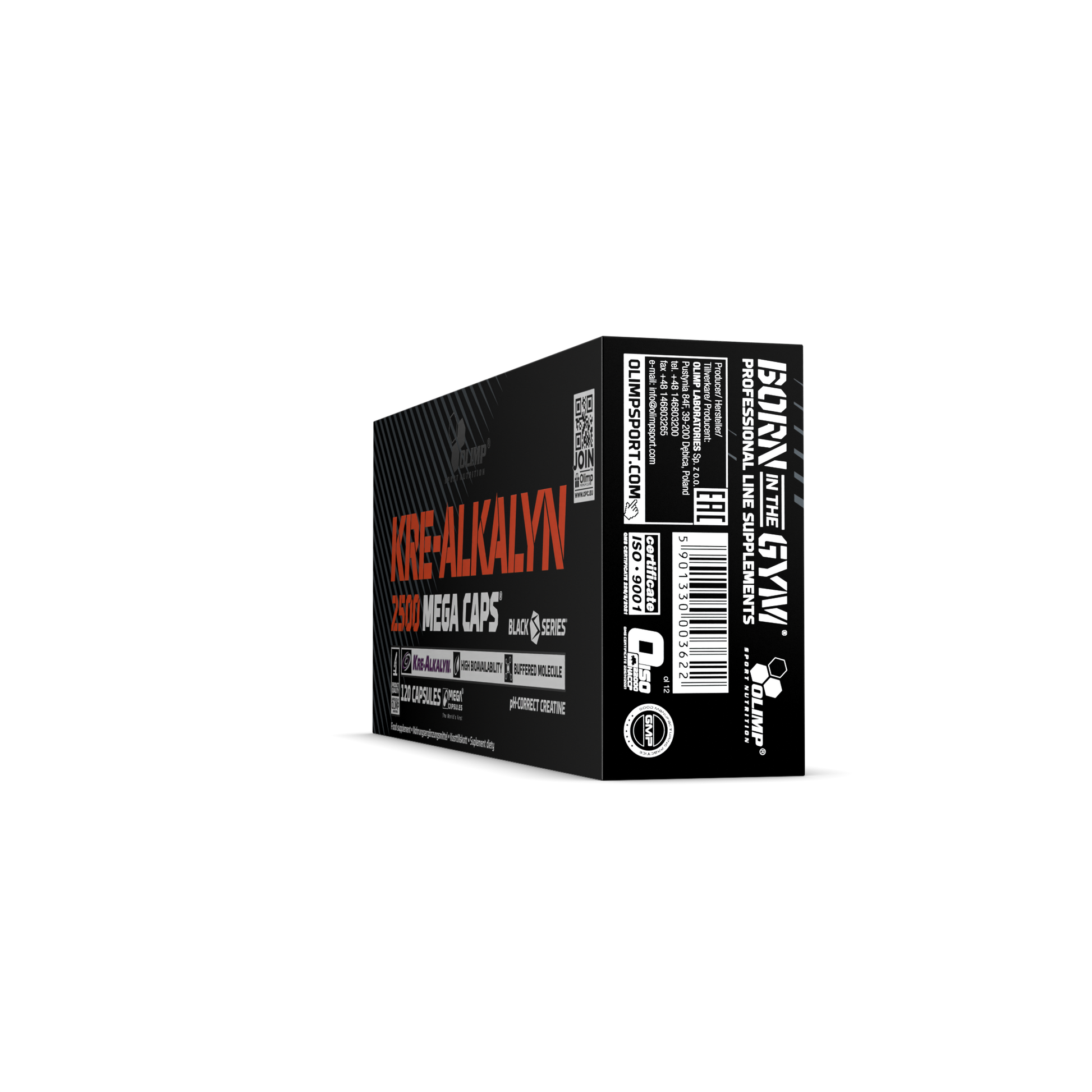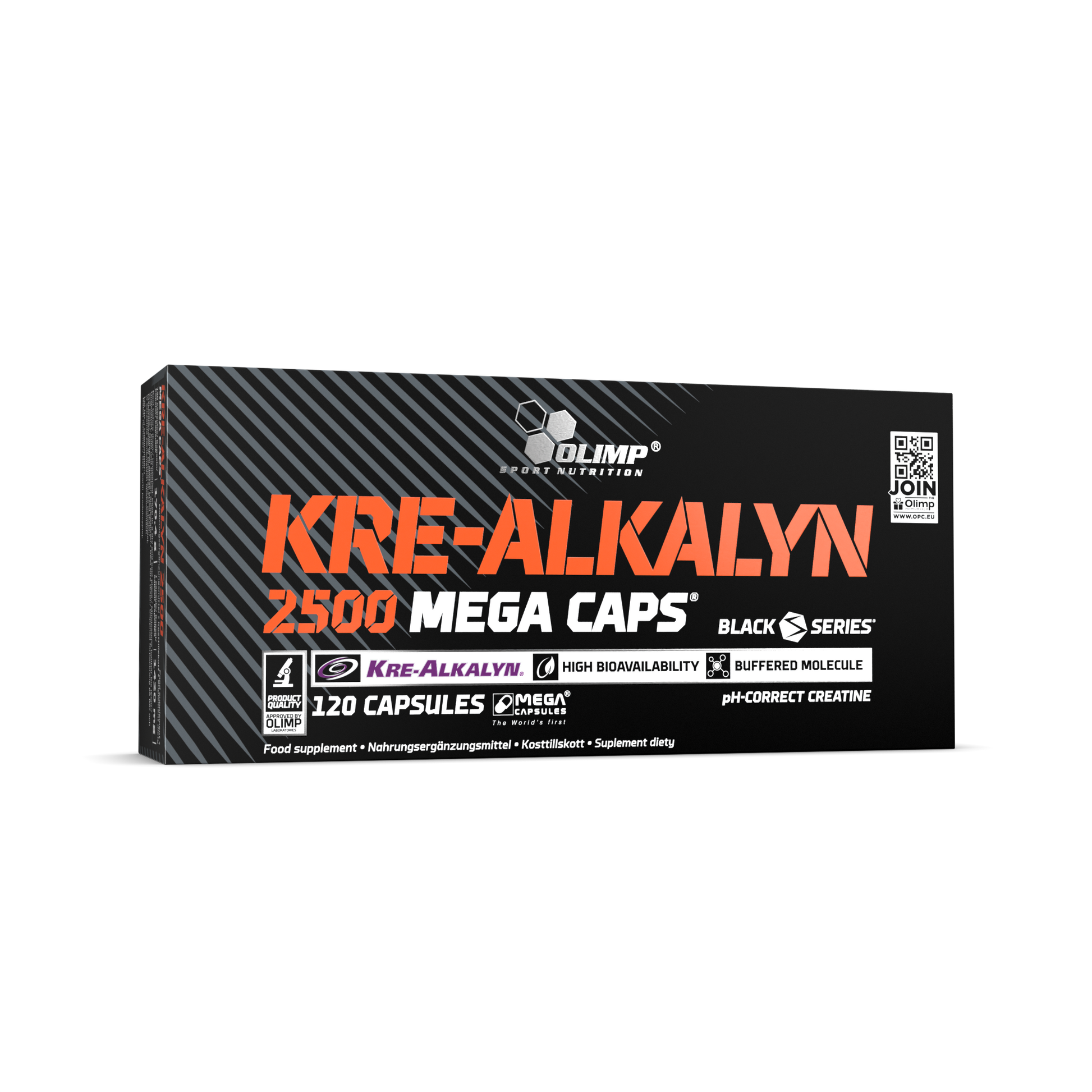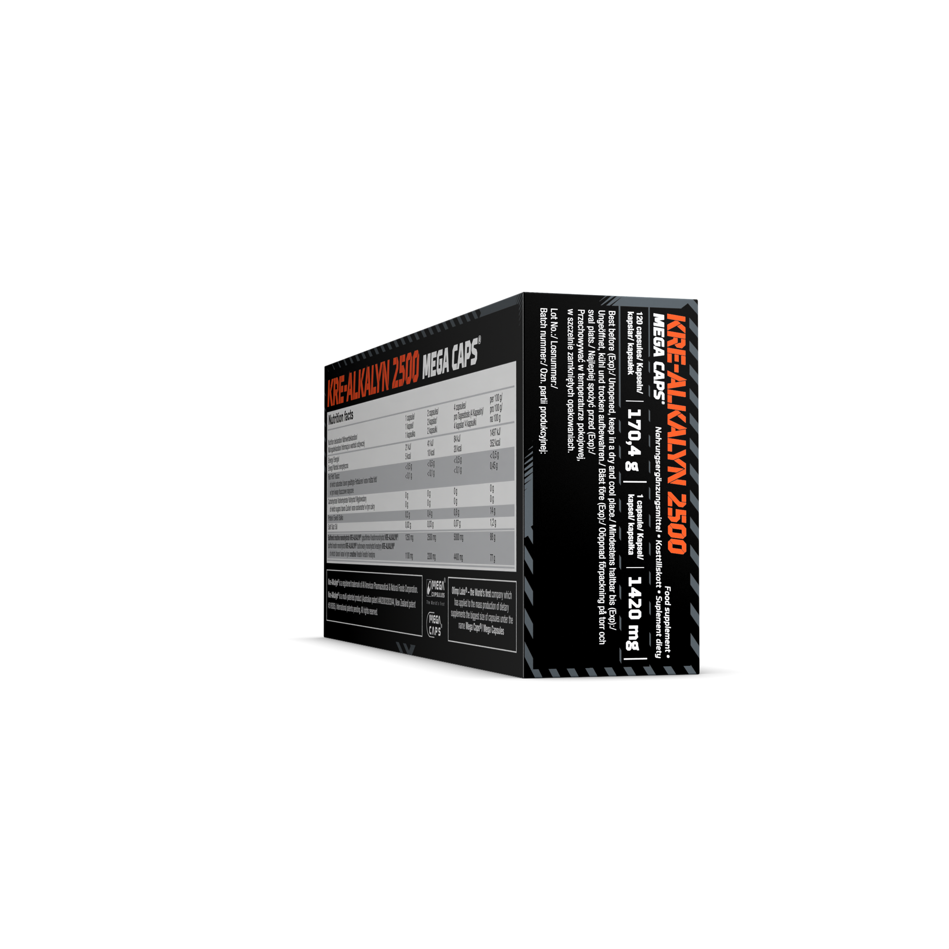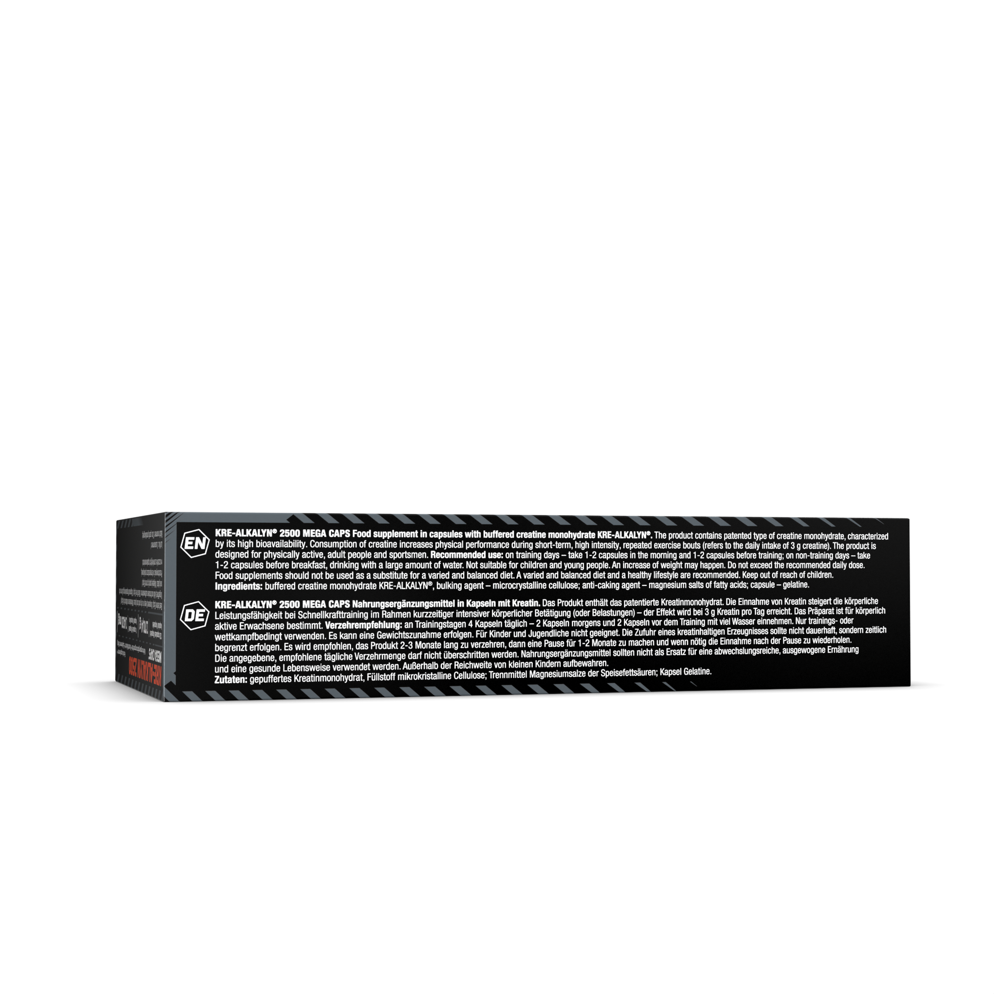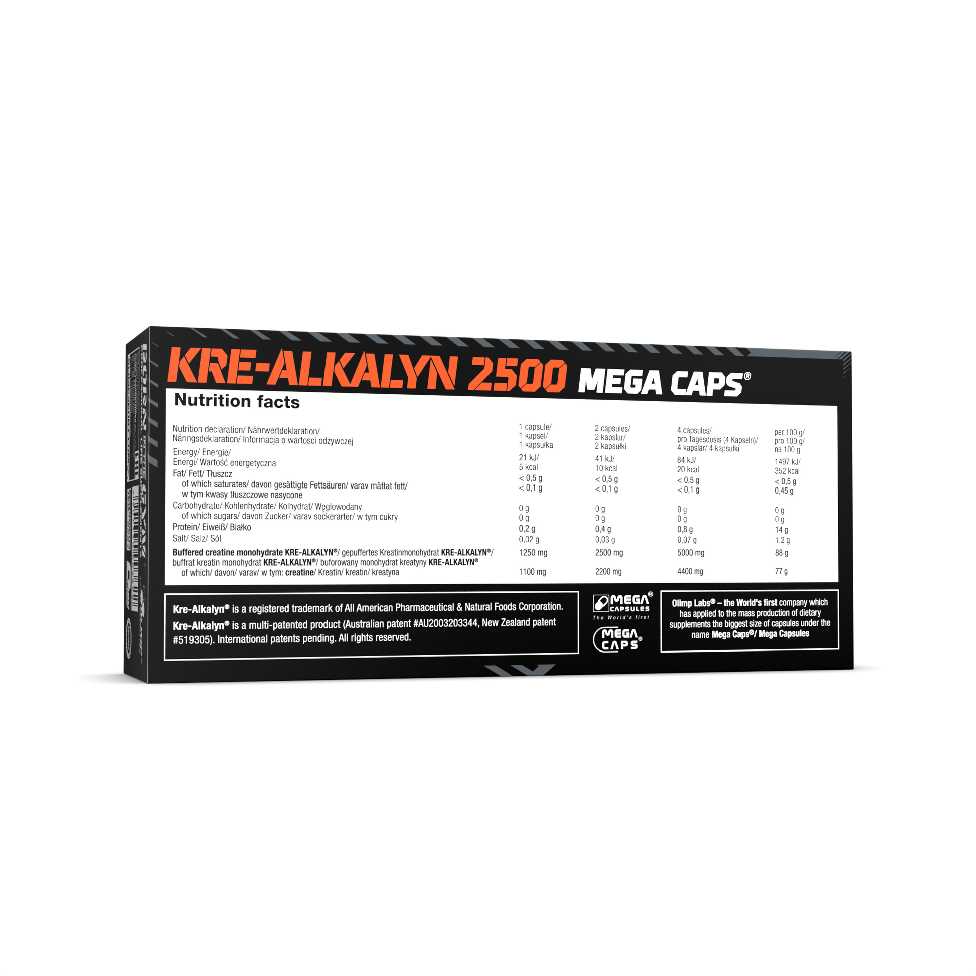 KRE-ALKALYN® 2500 MEGA CAPS Food supplement in capsules with buffered creatine monohydrate KRE-ALKALYN®The product contains patented type of creatine monohydrate, characterized by its high bioavailability. Consumption of creatine increases physical performance during short-term, high intensity, repeated exercise bouts (refers to the daily intake of 3 g creatine).