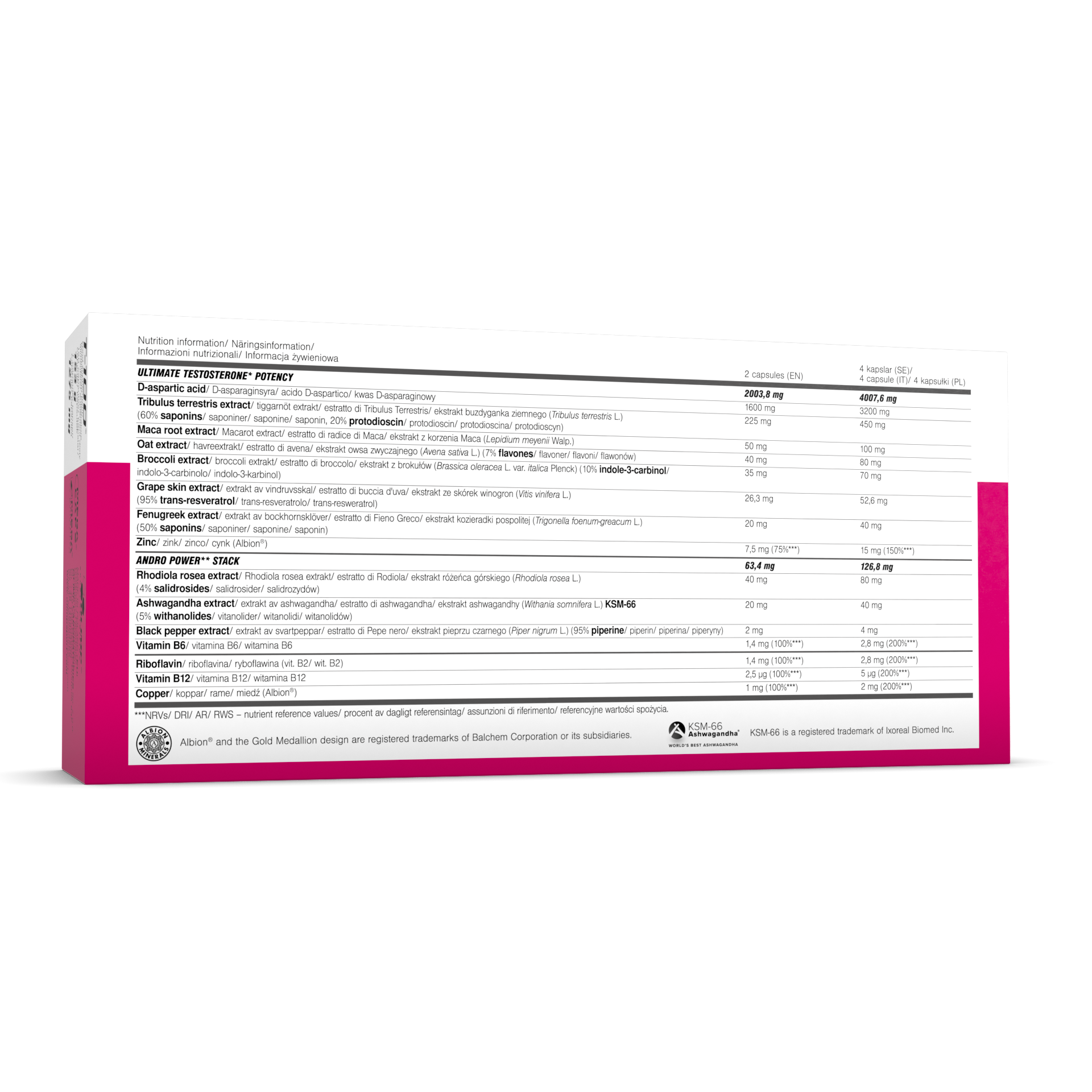Ingredients: D-aspartic acid, Tribulus terrestris fruit extract (Tribulus terrestris L.), bulking agent – microcrystalline cellulose; Maca root extract (Lepidium meyenii Walp.), anti-caking agents – magnesium salts of fatty acids, silicon dioxide; oat herb extract (Avena sativa L.), Rhodiola rosea root extract (Rhodiola rosea L.), zinc bisglycinate (zinc amino acid chelate Albion™), broccoli leaves extract (Brassica oleracea var. italica Plenck), grape skin extract (Vitis vinifera L.), fenugreek seed extract (Trigonella foenum-graecum L.), ashwagandha root extract (Withania somnifera (L.) Dunal) KSM-66®, copper bisglycinate (copper amino acid chelate Albion™), cyanocobalamin – vit. B12, black pepper fruit extract (Piper nigrum L.), pyridoxine hydrochloride – vit. B6, riboflavin – vit. B2, medium-chain triglycerides oil (MCT oil), capsule (gelatine, colour – E 132).