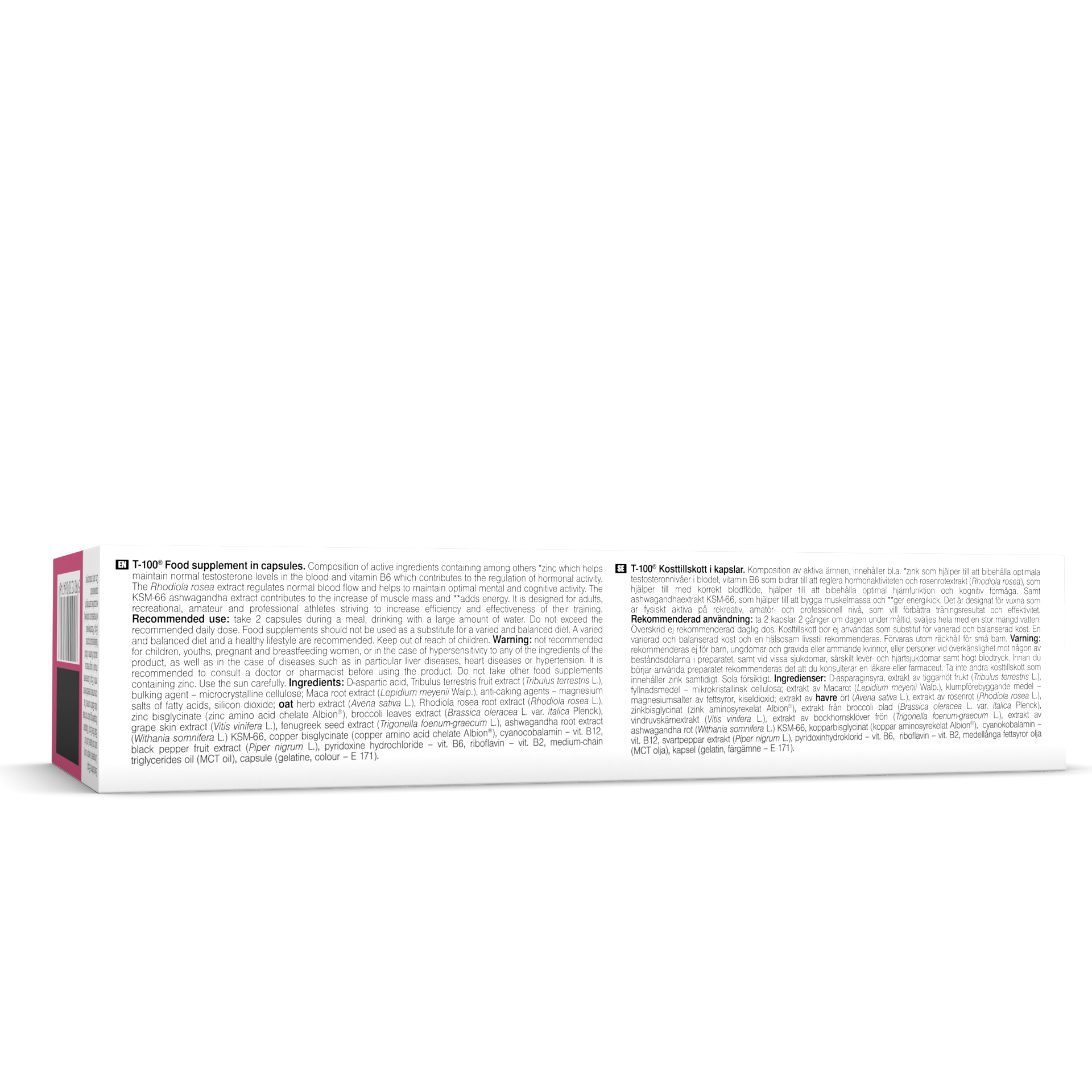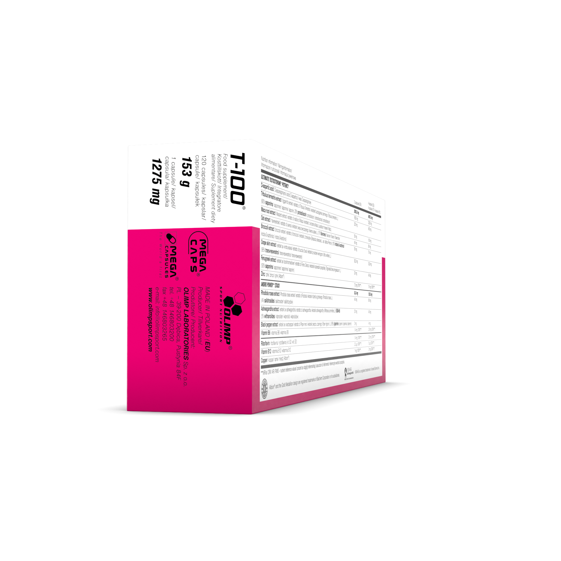 T-100® Food supplement in capsules.Composition of active ingredients containing among others *zinc which helps maintain normal testosterone levels in the blood and vitamin B6 which contributes to the regulation of hormonal activity. The Rhodiola rosea extract regulates normal blood flow and helps to maintain optimal mental and cognitive activity. The KSM-66® ashwagandha extract contributes to the increase of muscle mass and **adds energy.