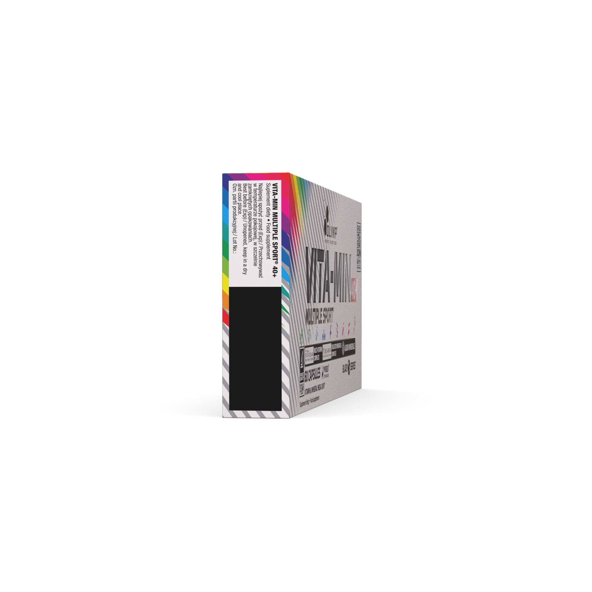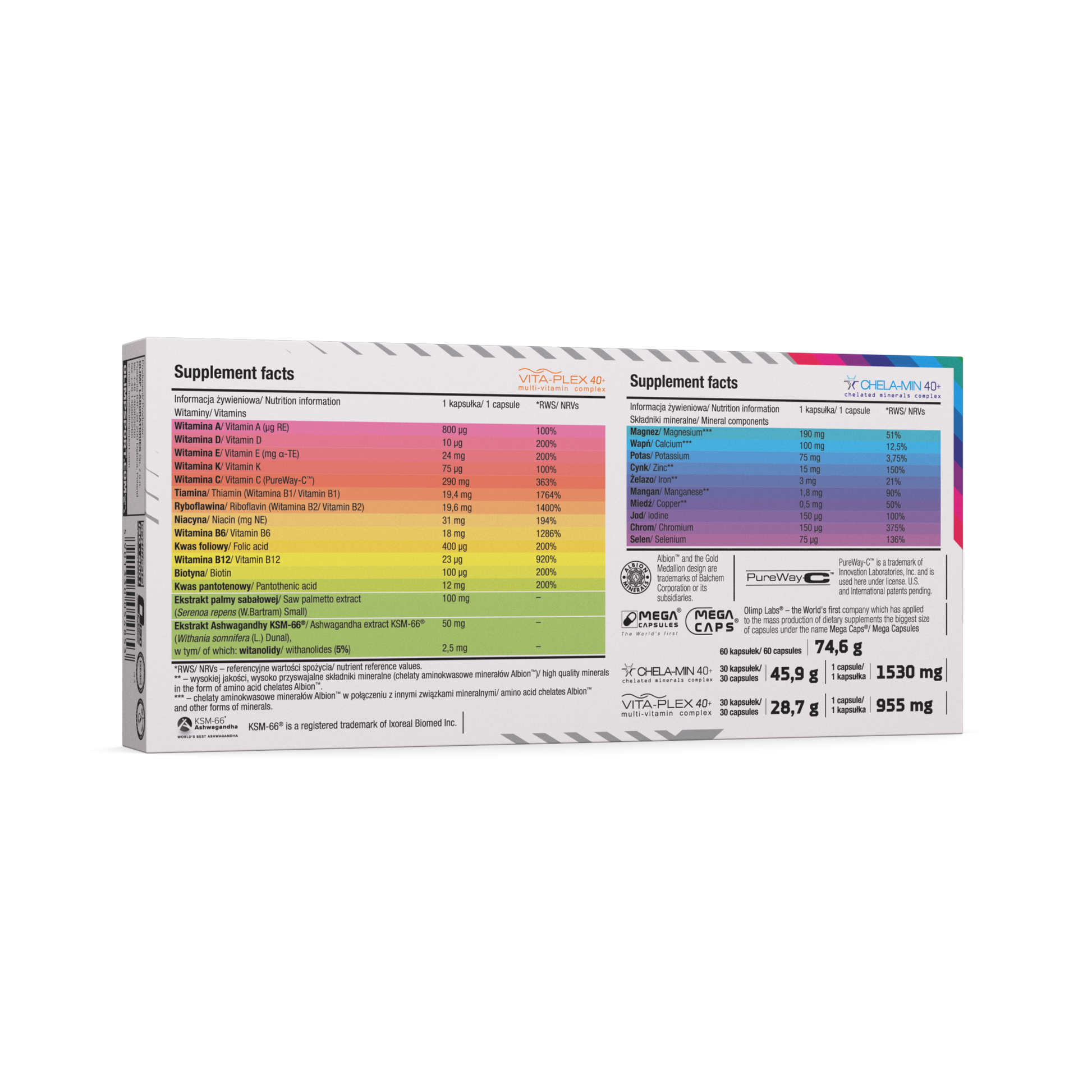 VITA-PLEX SPORT 40+ Ingredients: vitamins [vit. C (L-ascorbic acid, microencapsulated PureWay-C® complex), DL-alpha-tocopheryl acetate - vit. E, nicotinamide - niacin, cyanocobalamin - vit. B12, pyridoxine hydrochloride - vit. B6, thiamin mononitrate - vit. B1, riboflavin - vit. B2, retinyl acetate - vit. A, calcium D-pantothenate - pantothenic acid, menaquinone-7 - vit. K, cholecalciferol - vit. D, pteroylmonoglutamic acid - folate, D-biotin - biotin], Saw palmetto fruit extract (Serenoa repens (W.Bartram) Small), Ashwagandha root extract KSM-66° (Withania somnifera (L.) Dunal), bulking agent - microcrystalline cellulose; anti-caking agent - magnesium salts of fatty acids, silicon dioxide; capsule - gelatine.