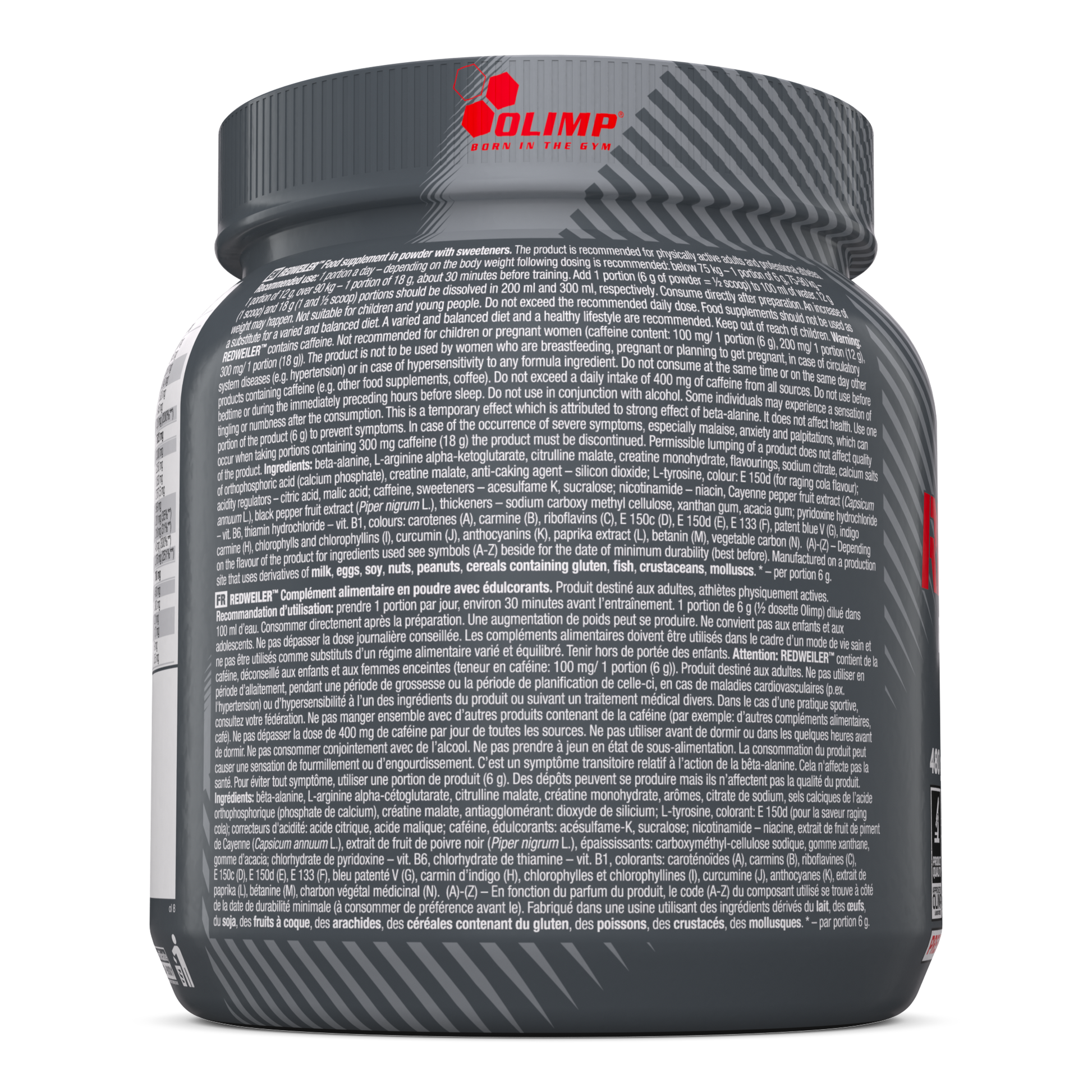 Warning: REDWEILER™ contains caffeine. Not recommended for children or pregnant women (caffeine content: 100 mg/ 1 portion (6 g), 200 mg/ 1 portion (12 g),