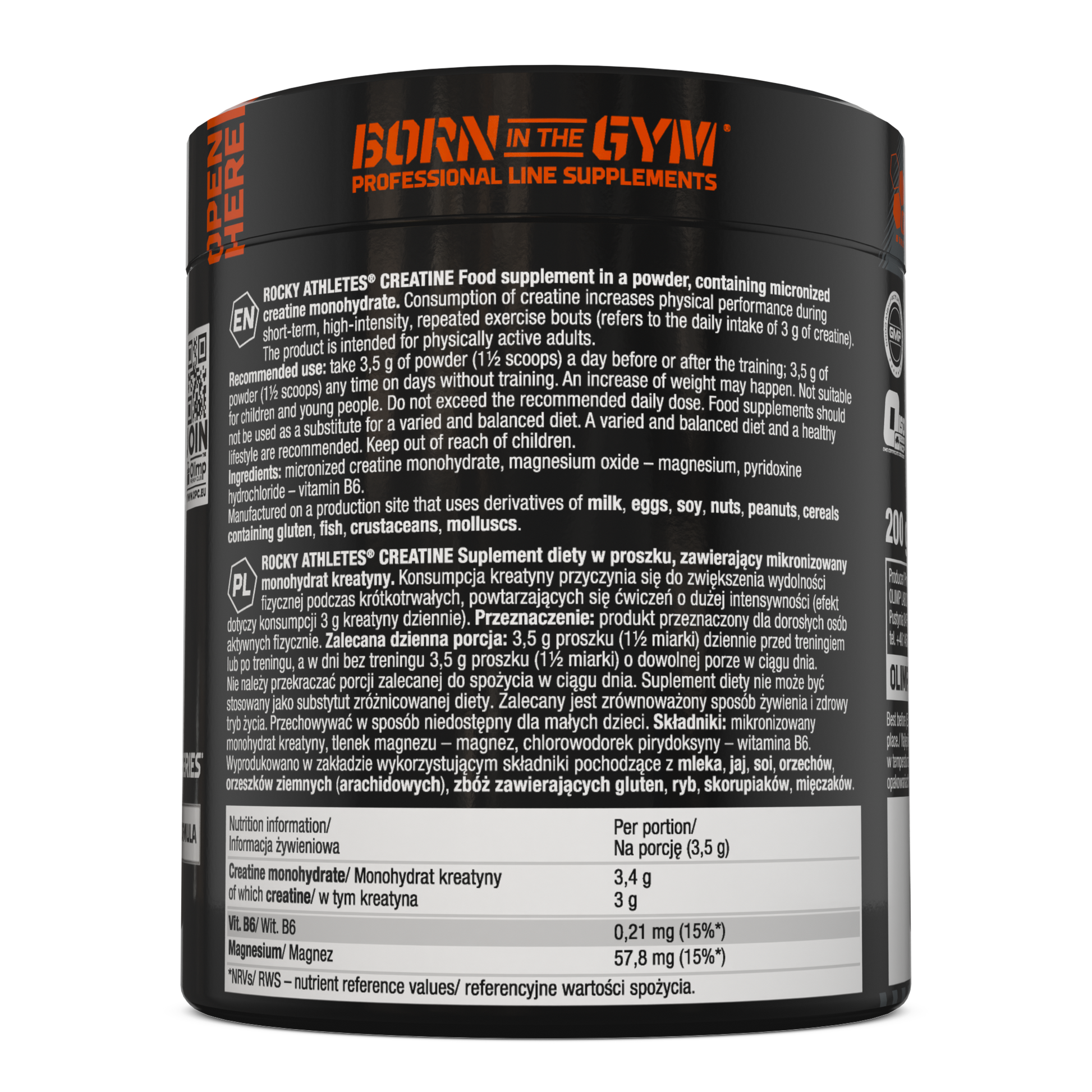 Recommended use: take 3,5 g of powder (1½ scoops) a day before or after the training; 3,5 g of powder (1½ scoops) any time on days without training. An increase of weight may happen. Not suitable for children and young people. Do not exceed the recommended daily dose. Food supplements should not be used as a substitute for a varied and balanced diet. A varied and balanced diet and a healthy lifestyle are recommended. Keep out of reach of children. Ingredients: micronized creatine monohydrate, magnesium oxide – magnesium, pyridoxine hydrochloride – vitamin B6. Manufactured on a production site that uses derivatives of milk, eggs, soy, nuts, peanuts, cereals containing gluten, fish, crustaceans, molluscs.